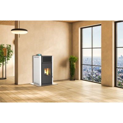 De witte Onyx Hydro 12 kW is geschikt voor ruimtes tot 250 m3. De vrijstaande pelletketel verwarmd het cv-water wat gebruikt kan worden om ruimtes te verwarmen. De Onyx hydro heeft een digitaal staand display en ventilatieroosters boven de deur. Voor een goede afvoer moet het rookkanaal minstens boven de dakrand uitsteken.